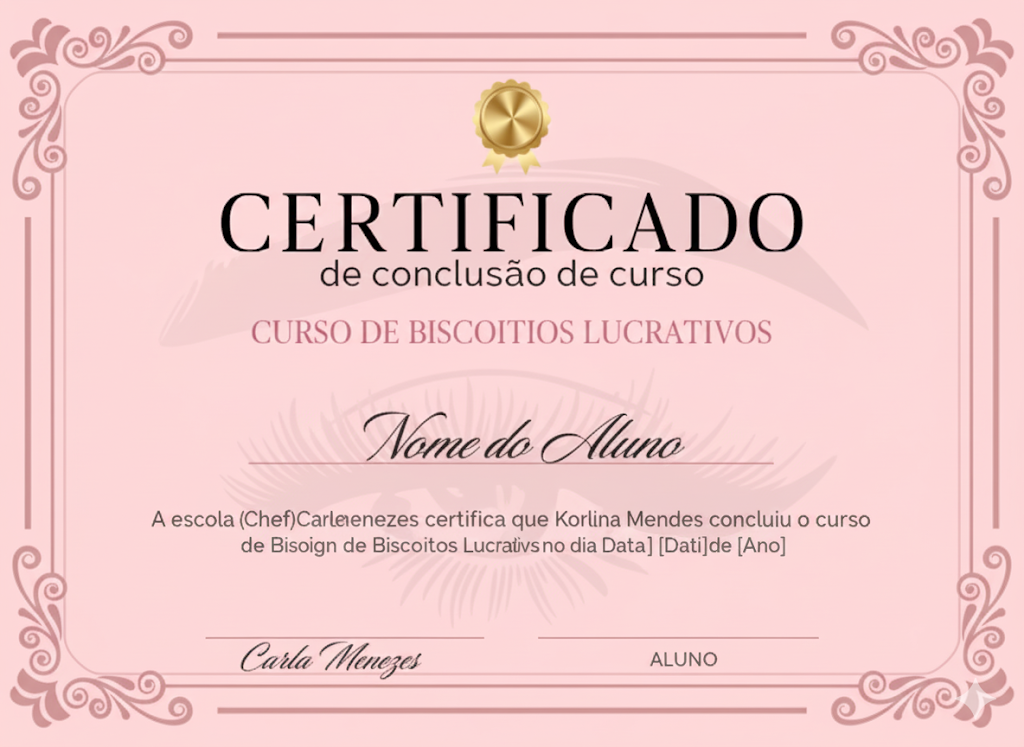 Após finalizar todas as aulas do curso você vai baixar, direto da sua área do aluno, um lindo certificado de conclusão atestando a sua capacitação na confecção de Biscoitos.